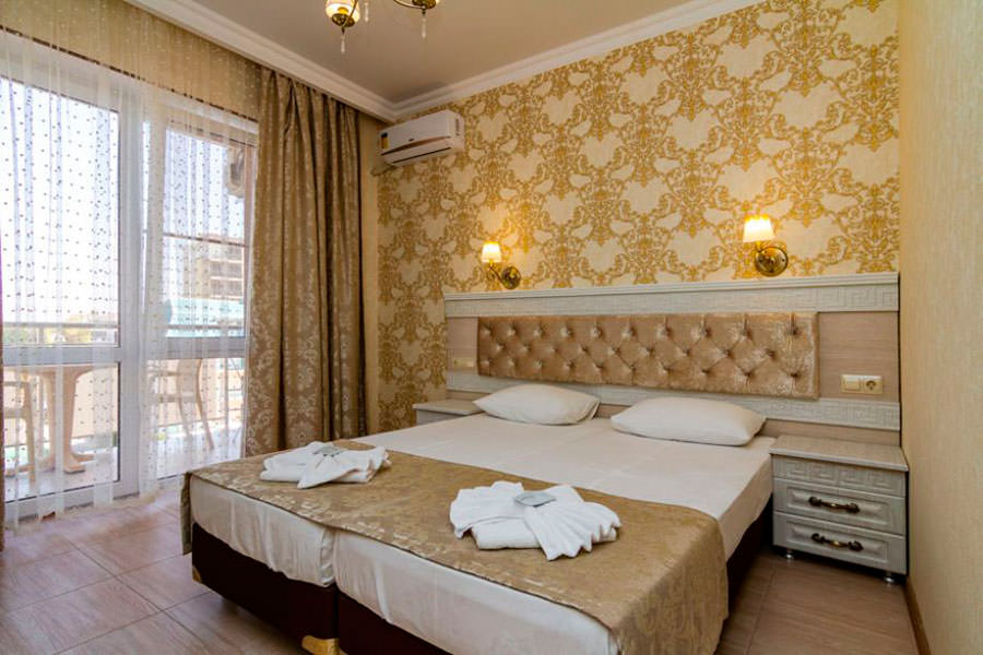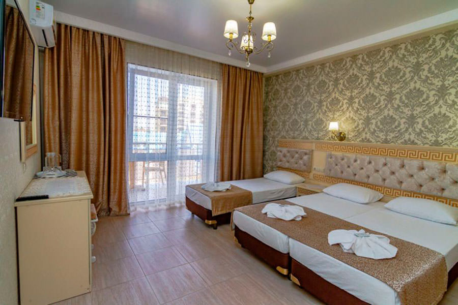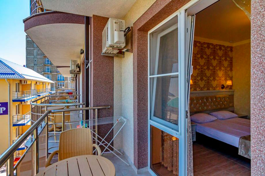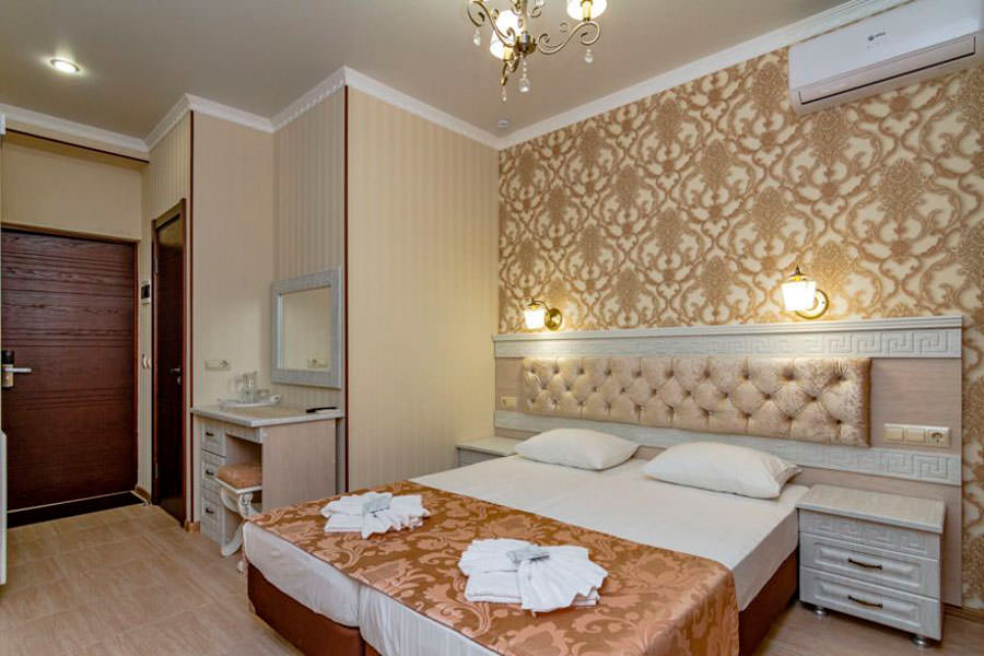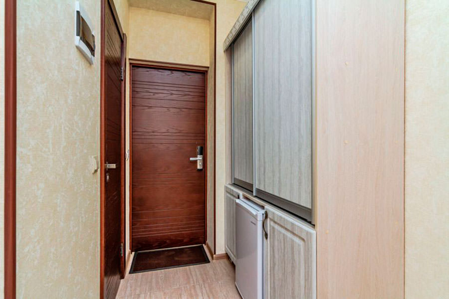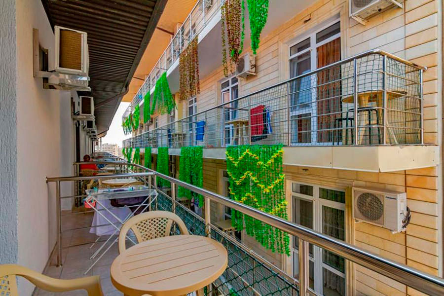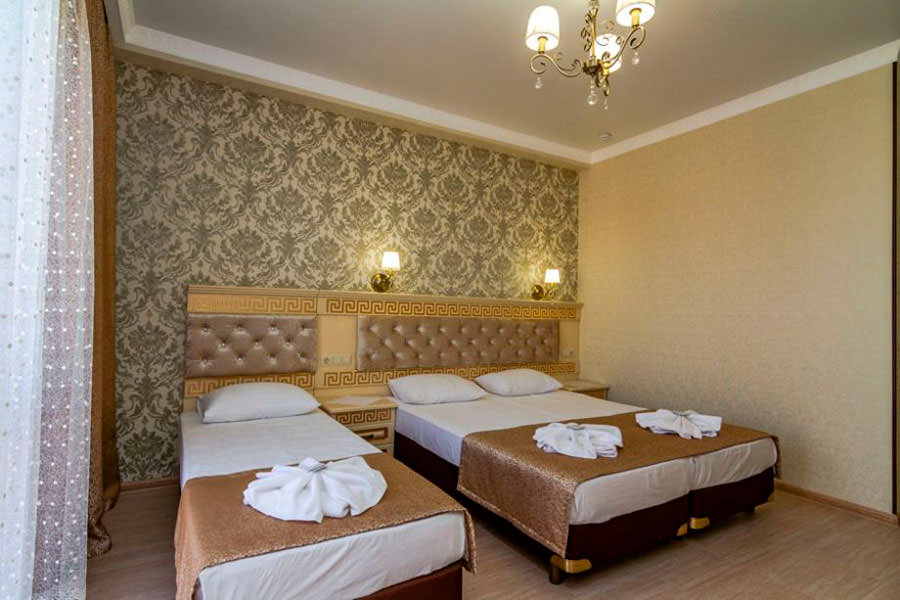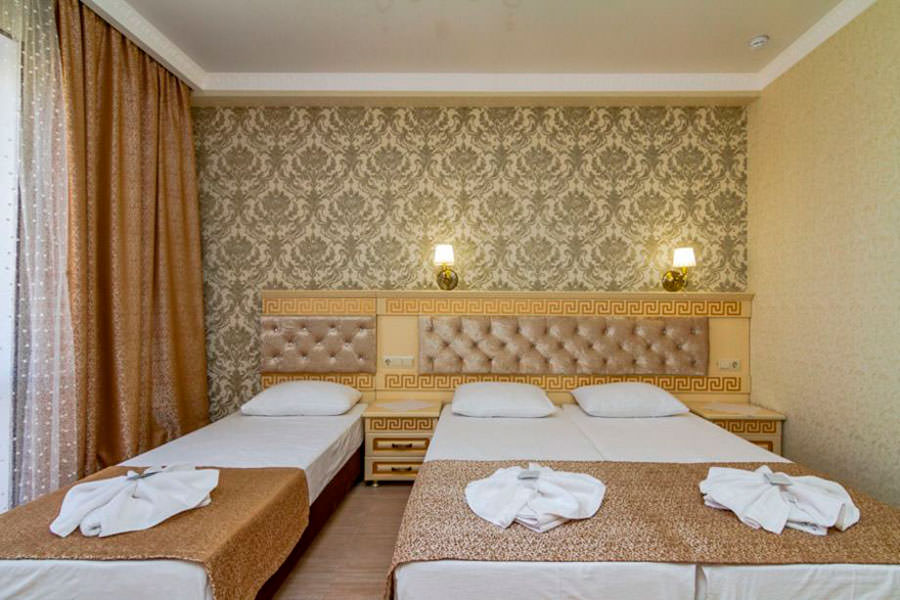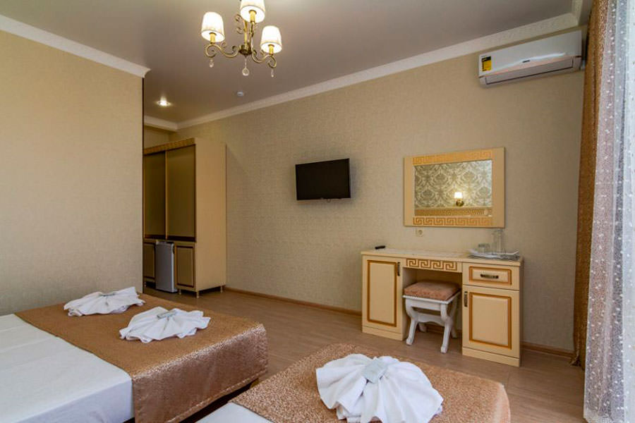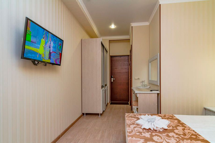 В номере: две односпальные, либо одна двуспальная кровати. В каждом номере телевизор, холодильник, кондиционер, бесплатный Wi-Fi. Сейф и круглосуточное видеонаблюдение на всей территории гостиницы. На каждом этаже гладильная доска и утюг. Уборка и смена белья, раз в три дня.